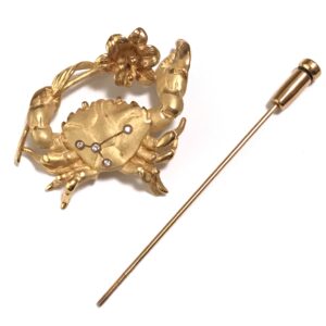 かに座のデザインが素敵なK18とダイヤモンドのブローチです。ピンブローチ部分が取れる仕組みになっている為、ペンダントトップとしてもご使用していただけます。 |
